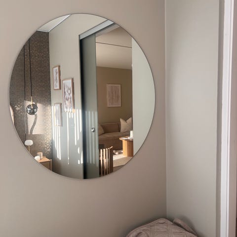 Kaila rundt speil. Rund veggspeil med enkel, minimalistisk utforming. Speilet passer til bruk i for eksempel entré, stue, soverom eller kjøkken. Nøytral stil som kan kombineres med ulike interiøruttrykk.