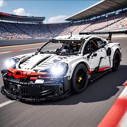 LEGO Technic Porsche 911 RSR byggesett. Modellen viser en detaljert racerbilsreplika med hvit, svart og rød fargekombinasjon. Settet har realistiske tekniske funksjoner som synlig boksermotor med bevegelige stempler, uavhengig hjuloppheng og detaljer i cockpit og karosseri. Egnet for byggere fra 10 år og oppover som ønsker en avansert Technic-modell av en Porsche 911 RSR.