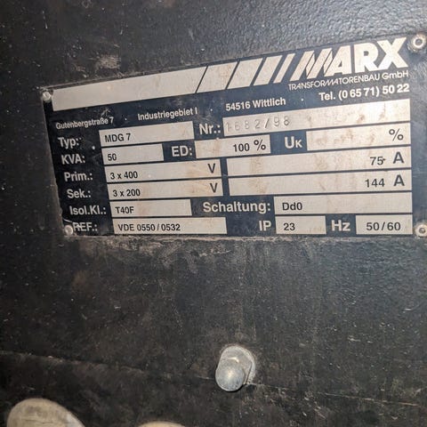 Noratel S010/0000/277B/042215 3-fase transformator for elektriske installasjoner. Transformatoren er kapslet i metallkabinett med løftekroker på toppen og monteringsfester i bunn. Typeplaten viser tekniske data for primær- og sekundærspenninger, effekt og frekvens (50 Hz). Enheten er egnet for bruk i industrielle eller kommersielle anlegg der det er behov for spenningsomforming eller galvanisk skille mellom kretser. Konstruksjonen med tre spoler og tilkoblingsklemmer på toppen gir mulighet for fast tilkobling i fordelings- eller styreskap etter gjeldende forskrifter.