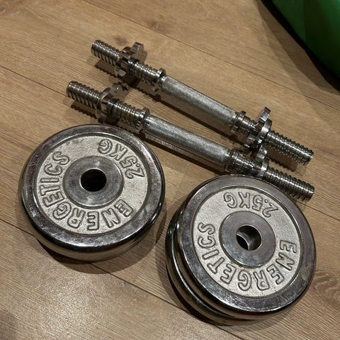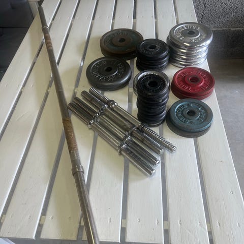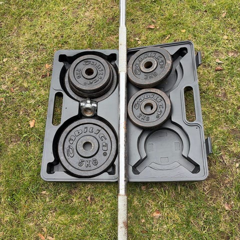 Koffert med 10 kg i vektskiver og to 35 cm lange vektstenger samt lås. Sammenlagt vekt er 13,6 kg. Perfekt å ha hjemme. Vektskivene er på 25 mm.