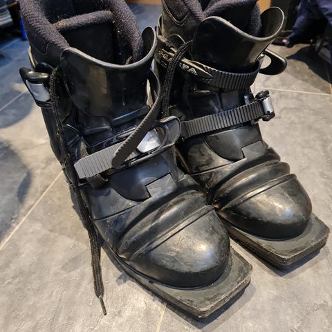Telemarks skistøvler i svart farge. Hele støvlen er i solid lær. Har to kraftige spenner foran og lisser for ekstra stramming. Overdelen har godt polstret innside for støtte og komfort rundt ankelen. Sålen er flat og tilpasset eldre type ski-/binding-system. Egner seg til bruk der denne typen skistøvler og bindinger fortsatt benyttes.