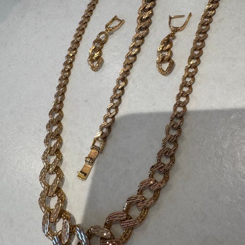 Meget pent gullsett som ikke har vært i bruk tidligere. Oppbevares i bankboks, og nå i våpenskap. Vi innvisterte i dette vakre settet i år 2000. Kjøper du kjede til takstpris, får du med armbånd og ring til en verdi av 93 000 kroner. Se bilde og tilstandsvurdering/takst.