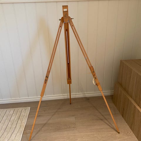 Staffeli i tre, sammenleggbart gulvstaffeli egnet for lerret og tegneplater. Justerbar høyde og vinkel på lerretsholderen. Passer til bruk hjemme, på kurs eller i atelier for maling og tegning.