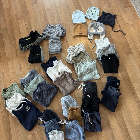 Klespakke med bukser, t-skjorter, gensere, allværsjakke, vest, skjorte, shortser, heldress. Merker som Lindex, hm, newbie, reflex. Pent brukt men bruksmerker kan forekomme