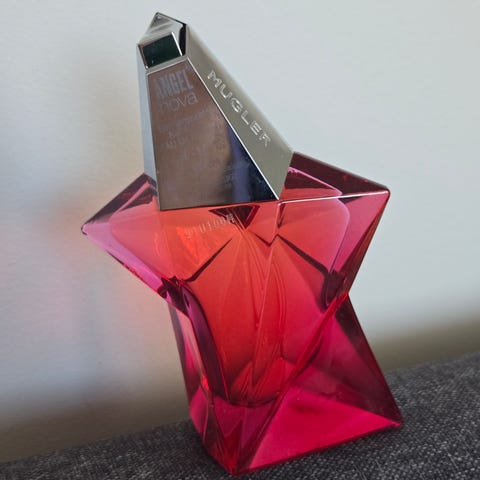 Mugler Angel Nova parfyme til dame, i karakteristisk stjerneformet flaske i rosa med sølvfarget topp. Dufttypen er eau de parfum. Leveres i original rosa eske merket Angel Nova Mugler.