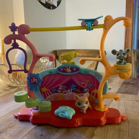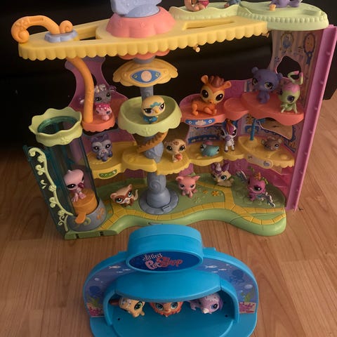 Littlest Pet Shop lekesett med fargerikt figurhus og flere små dyrefigurer. Settet består av en lekeplattform med ulike nivåer, husker og sitteplasser til figurene. Medfølgende figurer er ulike kjæledyr i forskjellige farger og størrelser, som kan plasseres rundt på lekesettet. Egnet som rollelek-leke for barn som liker å samle og leke med små figurer.