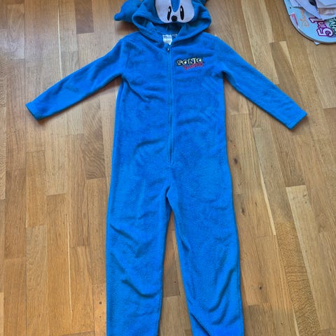 H&M Sonic heldress for barn i størrelse 110. Heldressen er blå og laget i polyester. Den har hette med påsydd Sonic-motiv og detaljer. Glidelås foran for enkel av- og påkledning. Mykt og loddent materiale.