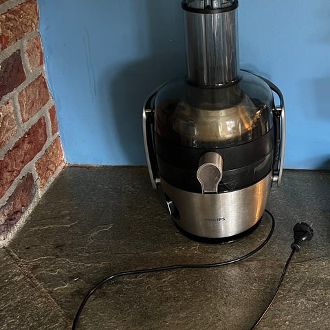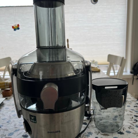 Philips juicemaskin i bordmodell. Apparatet har beholder for juice og stor påfyllingsåpning for frukt og grønnsaker. Huset er i hovedsak i metall og plast, og maskinen kobles til med ledning og vanlig stikkontakt. Egnet til å lage juice av ulike typer frukt og grønnsaker på kjøkkenbenk.