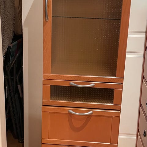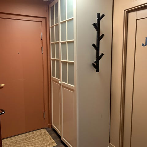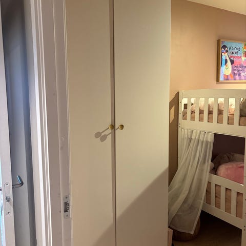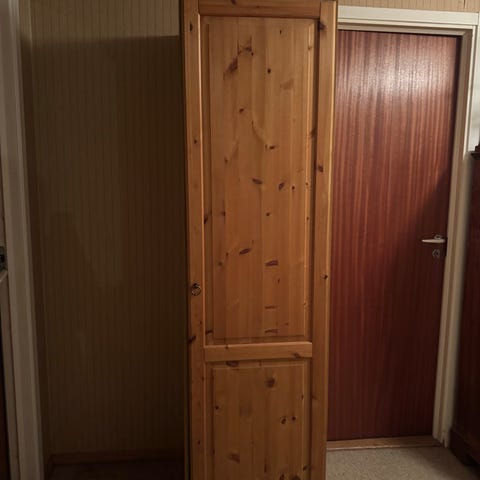 God lagringsplass inni skapene med skuffer,hyller og plass til å henge skjorter og kjoler.