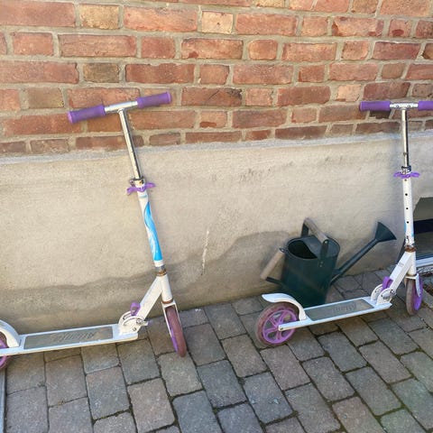 To sparkesykler med små hjul. Én sparkesykkel i metallfarge med enkel konstruksjon, og én rosa sparkesykkel med justerbart styre og håndtak med lilla grep.