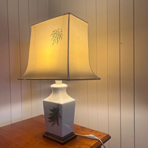 Flott stor vintage bordlampe i porselen med plisséskjerm. Gir et varmt og fint lys på grunn av den varme fargen på skjermen. I fin stand. Flatt vanlig støpsel. Sendes ikke. Må hentes i Bergen.