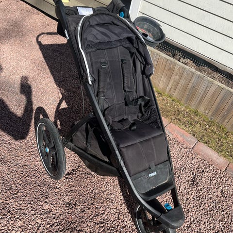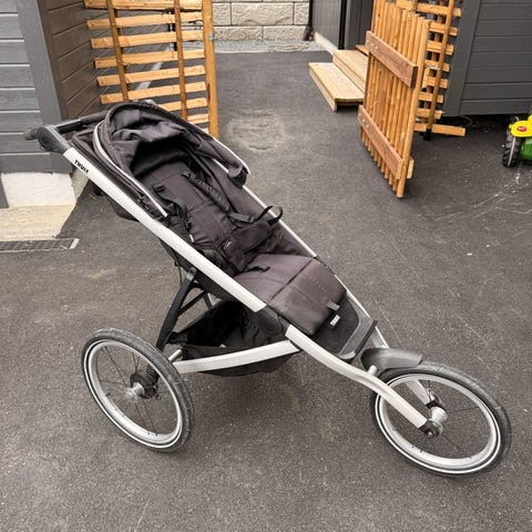 Pent brukt Thule Glide 2 joggevogn, med tre hjul i jet black og sølvfarget ramme.