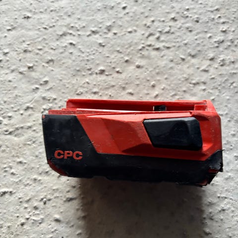 Hilti CPC batteripakke i rød og svart plast. Batteriet er beregnet for bruk med Hilti elektroverktøy som benytter CPC-systemet. Passform og tilkobling er tilpasset Hilti-maskiner med tilsvarende batterifeste. Egner seg som erstatnings- eller ekstra batteri til kompatible Hilti verktøy.