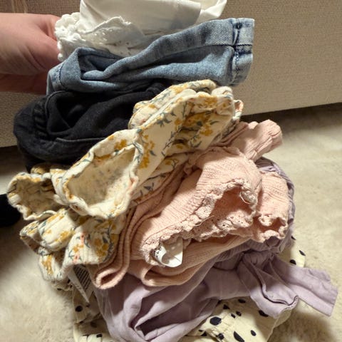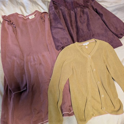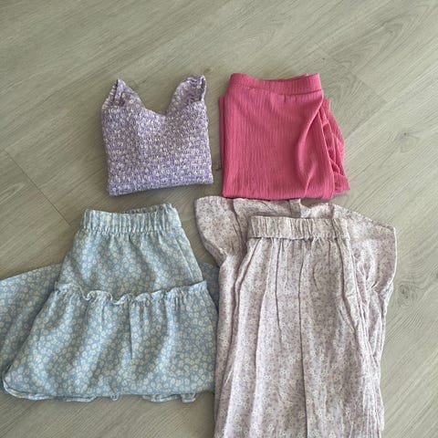 Langt skjørt, topp, genser og cardigan str 122/128 selges samlet for 100 kr