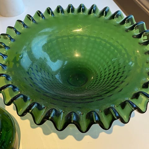 Vintage grønn og fin glassskål.