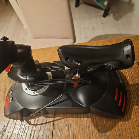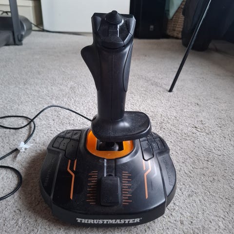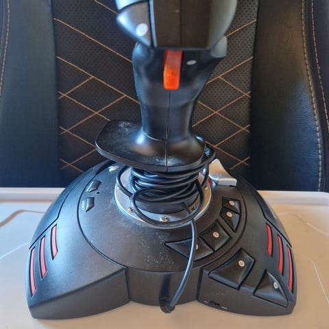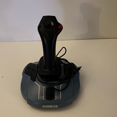 Thrustmaster joystick til PC. Kablet spillkontroller med base og styrespak i sort plast med røde detaljer. Flere knapper er plassert på basen og på selve stikken for ulike funksjoner i spill. Egnet til flysimulatorer og andre PC-spill som støtter joystick-kontrollere.