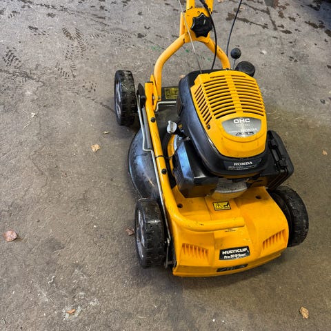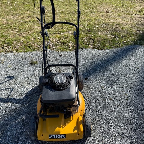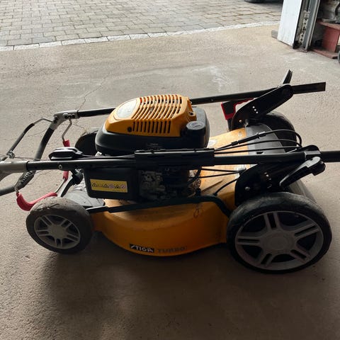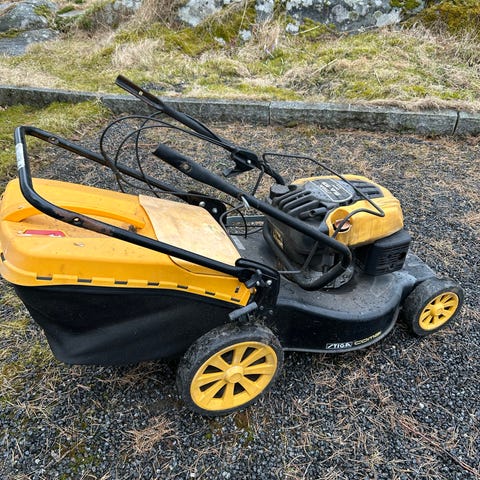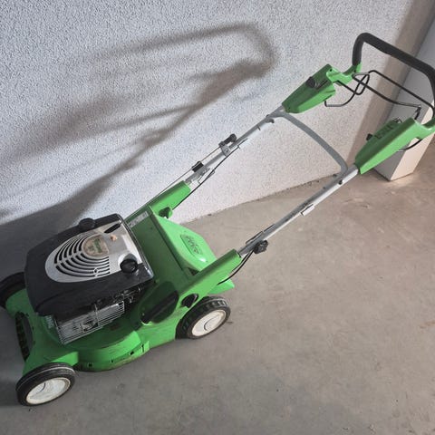 Gressklipper med bioklipp. Enkel modell uten fremdrift på hjula. Starter og går.
