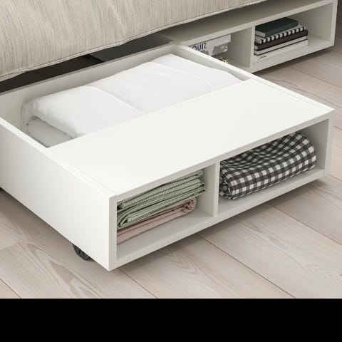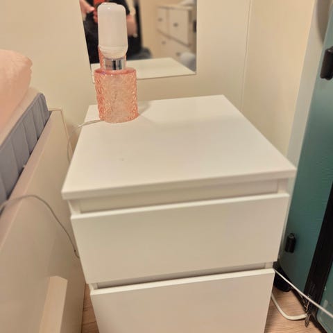 Har én side med skuffe og dør, og én side med hyller uten dør. Ekstra dør kan kjøpes på ikea.