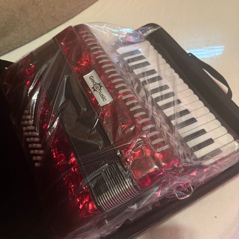 Trekkspill pianoakkordeon i rød perlemor-finish. Instrumentet har pianotangenter på høyre side og bassknapper på venstre side. Leveres i koffert/veske som gir beskyttelse under lagring og transport. Passer til bruk i øving og fremføring innen ulike musikksjangre. Bare prøvd så nesten ikke brukt.