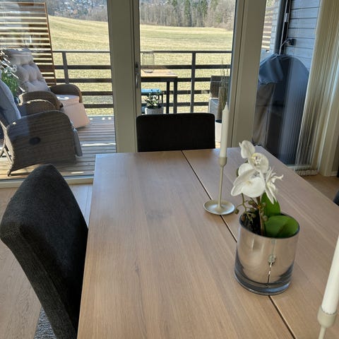 Lite og pent brukt spisebord i heltre eik. Bordet har to innleggsplater som er nedfelt i bordet. Øker lengden med 50 x 2 cm. Bordet er kjøpt på Bohus.. Ny pris 19900. Selges for 5000.