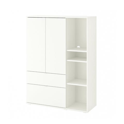 Praktisk TV-hylle (LAPPLAND) fra IKEA som også fungerer fint som oppbevaring. Vi har brukt den som et alternativ til skap, og den rommer overraskende mye.