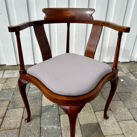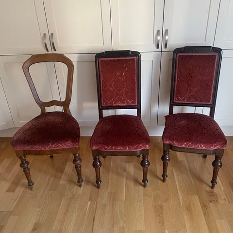 Spisestuestoler i mahogni med ballong rygg. Stolene har polstret sete trukket i lyst stoff med bladmotiv i kontrastfarge.