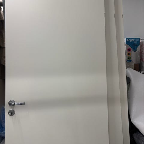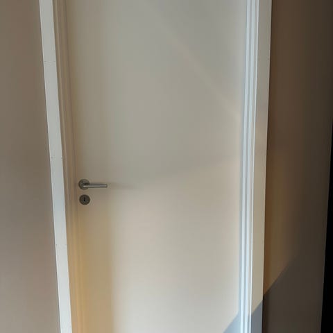 Selger 8 stk hvite Swedoor dørblad, nye i 2014. Døren leveres med kun håndtak og låskasse. Standard rett dørblad med glatt overflate.