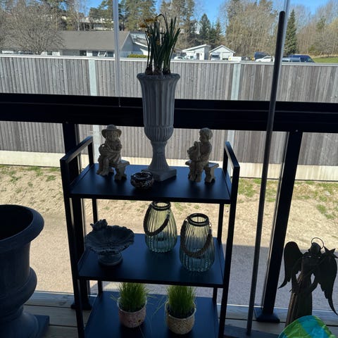 Svart frittstående hylle i tre med flere åpne hyllenivåer. Smal og høy konstruksjon som egner seg til oppbevaring av håndklær, bøker, dekor eller andre gjenstander. Passer i bad, stue, gang eller andre rom der det er behov for vertikal oppbevaringsplass.