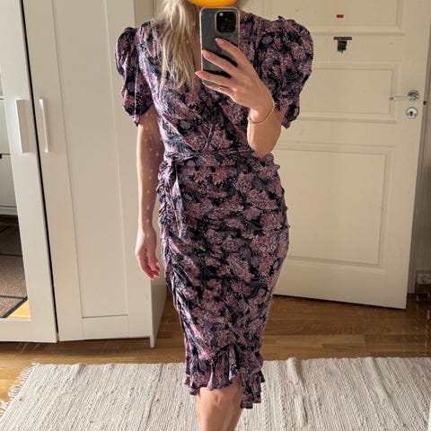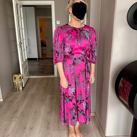 Ravn festkjole i størrelse S for dame. Kjolen er laget i viskose og har en rosa bunnfarge med blomstrete mønster. Modellen har lange, vide ermer, knappelukking foran og tilhørende belte i livet. Skjørtet er kort med vid, plissert fasong. Passer som penkjole eller til festlige anledninger.