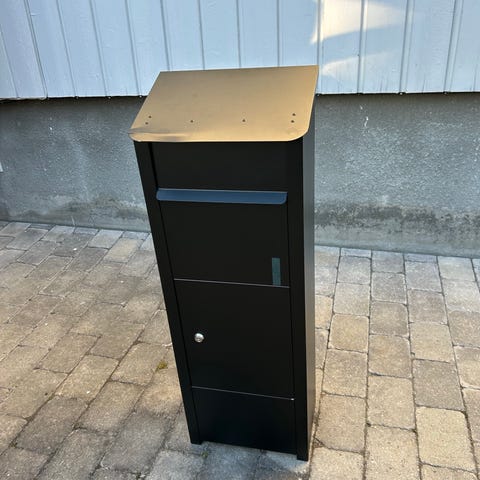 Allux pakkepostkasse i svart metall. Postkassen har innkast øverst og låsbar dør nederst for uttak av post og pakker. Egnet for montering ved bolig eller hytte der det er behov for mottak av både brev og mindre pakker. Stabil konstruksjon i metall med glatt bakside for plassering inntil vegg eller stativ. Nøkkel og monteringsveiledning følger med skapet, se bilder for innredning og detaljer.
