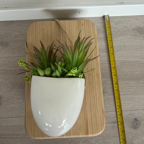 Eva Solo oppbevaringskurv i hvit med trehåndtak. Kurven har avrundede kanter og åpen topp, egnet til oppbevaring på kjøkken, bad eller andre rom. Høyden er om lag 10 cm, som vist på bildet med målebånd. Materialet er hard plast med håndtak i tre, og kurven kan brukes til for eksempel småting, flasker eller rengjøringsutstyr.