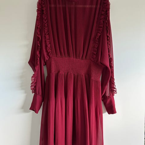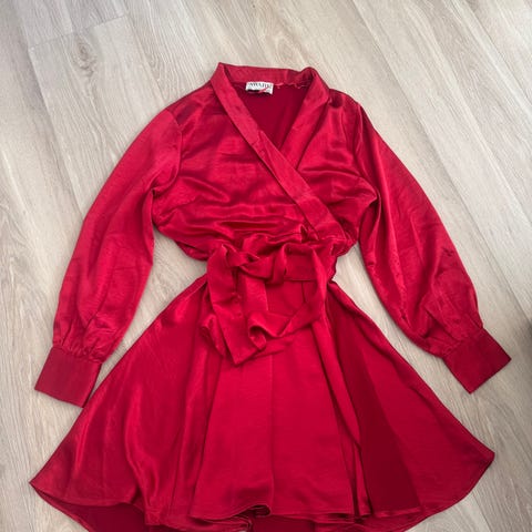 Zara hverdagskjole for dame i rød farge. Kjolen er i polyester og oppgis i størrelse one size. Modellen har lange ermer med mansjetter og knytebelte i livet. Passer som enkel hverdagskjole eller til mer pyntede anledninger avhengig av styling.