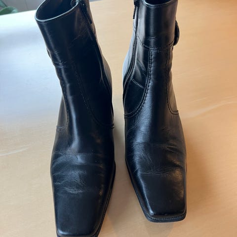 Gabor støvler i størrelse 38. Høye skaft med glidelås på innsiden. Svart skinn med middels høy hæl. Klassisk modell som passer til hverdagsbruk og penere anledninger for dame. Ble litt små til meg.