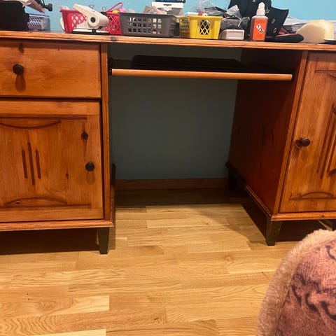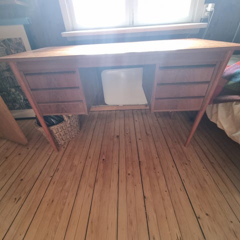 Gammelt skrivebord i lyst treverk.