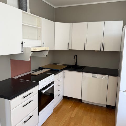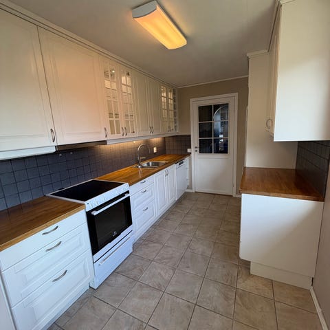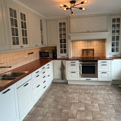 Henta kjøkkenet sjølv på Finn, men vart ikkje heilt sånn eg hadde tenkt. Gis vekk vidare heilt eller i deler. Hjørnemodulen må er lealaus, og må skruast til. Kjøkkeninnredning er hvit profilert stil med både over- og underskap. Overskapene har delvis glassfronter med sprosser, og gir god plass til oppbevaring av servise og kjøkkenutstyr. Underskapene består av skap og skuffer med matchende fronter. Det følger med benkeplater i treverk som går langs begge sider av kjøkkenet, inkludert plass til frittstående komfyr. Kjøkkenet har også hjørneløsning med skap, samt åpne hyller ved komfyrdelen. Innredningen passer til vanlig kjøkkenbruk med god arbeids- og oppbevaringsplass.