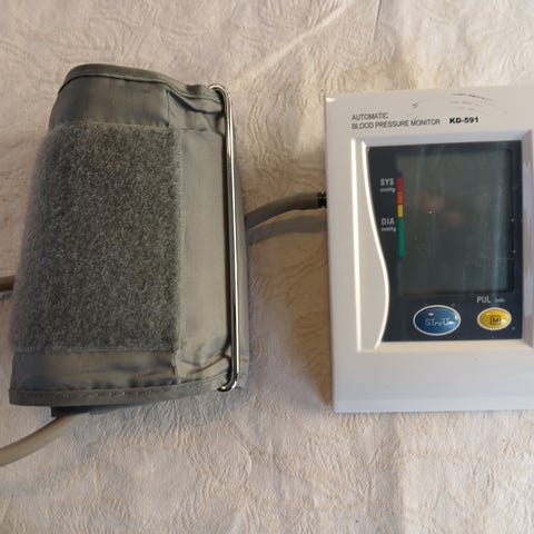 Selger en batteridrevet blodtrykksmåler (med nye batterier) for overarm med digital skjermenhet, mansjett og oppbevaringsetui. Apparatet har slange til mansjett og betjeningsknapper på fronten. Mansjetten festes rundt overarmen ved måling av blodtrykk. Det følger med mykt etui for lagring og transport, samt bruksanvisning.