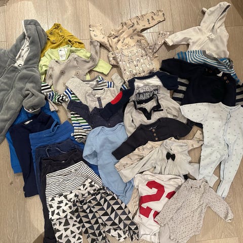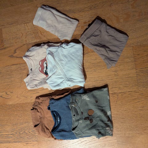 Klespakke i størrelse 74. Pakken inneholder ulike plagg som blant annet langermede bodyer, bukser og gensere i flere farger og mønstre.