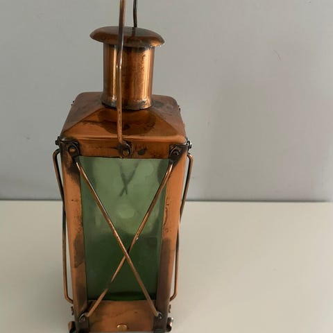 Unik vintage sladreflaske / vinholder i kobber med grønt glass.