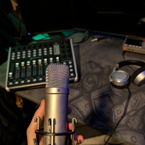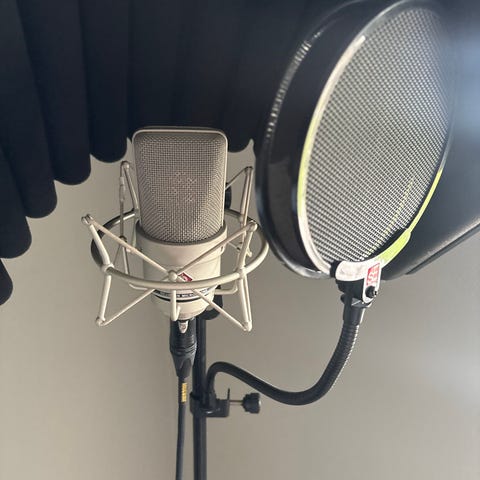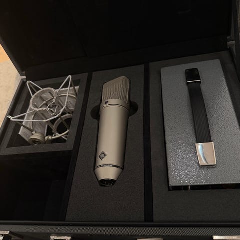 Studio kondensatormikrofon med støtfeste og oppheng på mikrofonstativ. Mikrofonen leveres med en beskyttende koffert i tre med metallhengsler og lås, samt tilhørende nøkler. Egner seg for innspilling av tale, vokal eller instrumenter i hjemmestudio eller prosjektstudio. Det følger med kabelfeste på mikrofonstativet, og mikrofonen er montert i elastisk støtdempende oppheng for å redusere håndteringsstøy. Merke og nøyaktig modell er ikke angitt.