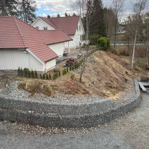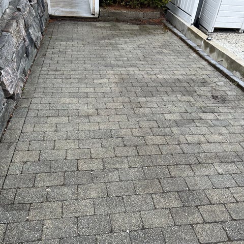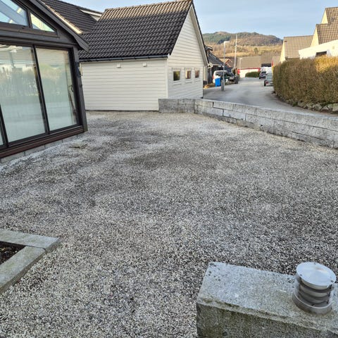 Belegningsstein for utendørs bruk i grå nyanse. Steinene er lagt som dekke i hageområdet og gangvei rundt enebolig. Egnet til gårdsplass, gangarealer, uteplass og lignende bruksområder der det er behov for et fast og slitesterkt dekke.