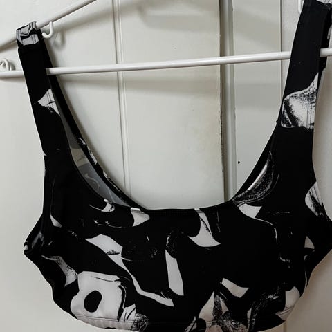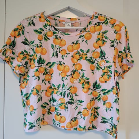 Selger en fin og lett topp fra Monki i størrelse S. Toppen har et unikt og fargerikt mønster med sommerfugler i sterke farger – perfekt for vår og sommer 🌸