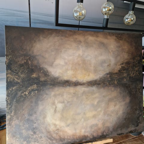 Abstrakt maleri på lerret i brun- og beigefarger. Kjøpt på Tise av en flink jente som har malt selv, men det passet dessverre ikke inn hos oss. Nypris kr 1500.