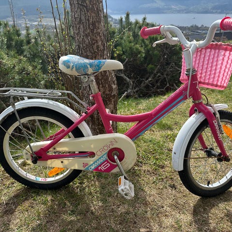 White barnesykkel 16" i oransje farge med gule detaljer. Sykkelen har 16-tommers hjul tilpasset barn som har vokst ut av balansesykkel og skal over på tråsykkel. Modellen har lav innstegshøyde som gjør det enklere å komme av og på sykkelen.