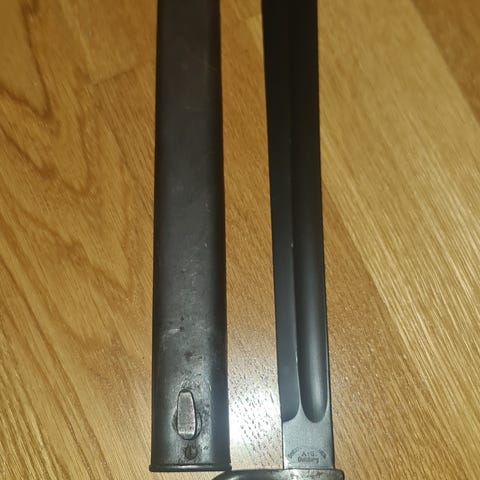 Selger denne bajonetten. Den har et fint håndtak og blad med lite rust. Selges for 1000 kr. Denne har fått et lag med universal balistol for å hindre rust🙂
