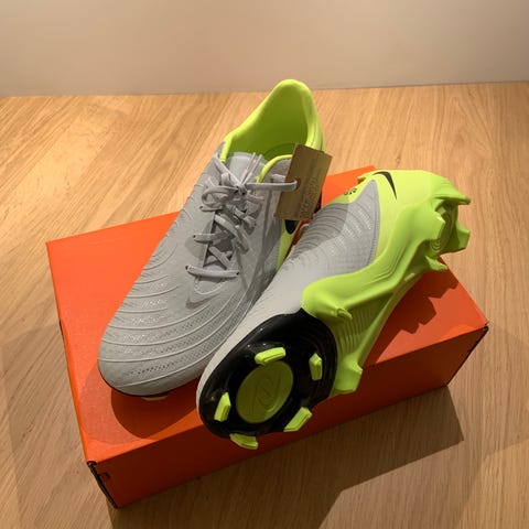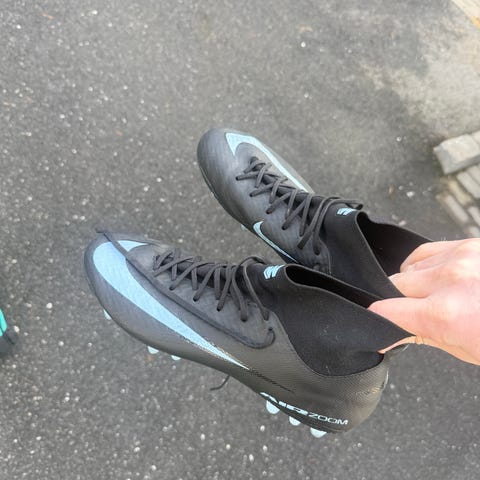 Nike Phantom fotballsko i svart med blå yttersåle og hvite lisser.