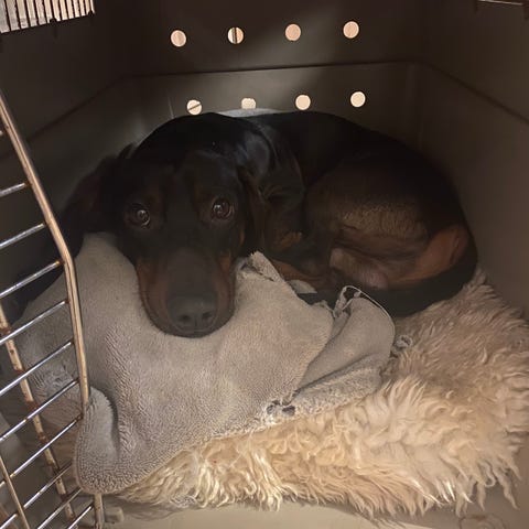 Med meg til varig hjem får jeg tingene mine (2 tøy senger, noe klær, sele og lenke, leke, bur som jeg sover i med døren åpen, vaksinasjonsheftet/helseboken min med chipnummeret mitt, og litt annet), obs sengen på bildet følger ikke med da den tilhører oppdretter.