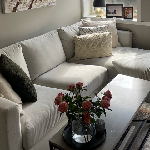 IKEA Vimle 4-seters sofa med sjeselong i fargen Gunnared beige. Sjeselongen kan også brukes til oppbevaring. Sofaen er både pent og lite brukt og har ikke noen synlige bruksmerker eller slitasje. Trekkene kan tas av og vaskes.