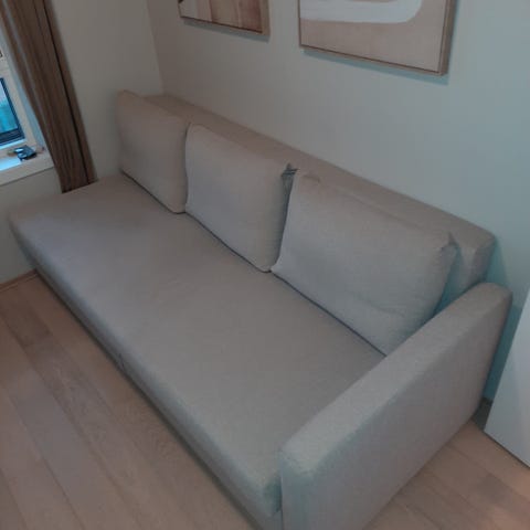 Det har vært hund i huset, men ikke i selve sofaen. Sofaen er vasket med jevne mellomrom, men er ikke renset før salg. Trekk kan tas av og vaskes.