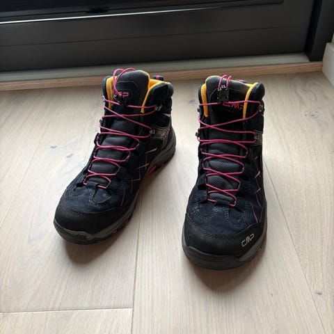 Fine og vanntette overgangssko/tursko for barn i størrelse 37. Skoene har snøring foran, forsterket tå- og hælparti samt grovmønstret yttersåle for godt grep. Merke: CMP. Innleggssåle med Ortholite-merke for økt komfort. Nesten ikke brukt.