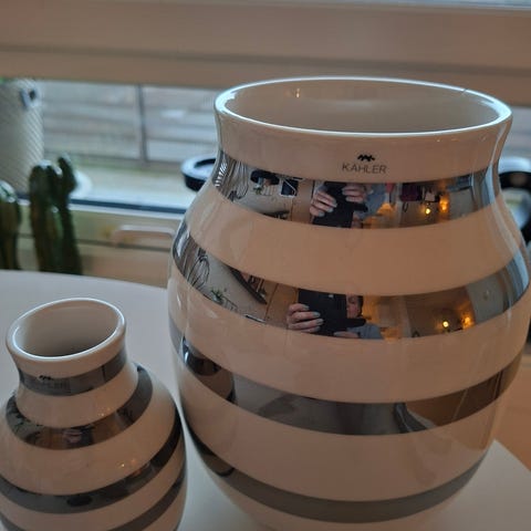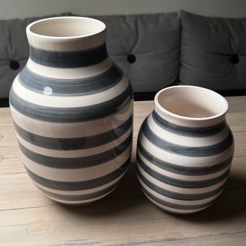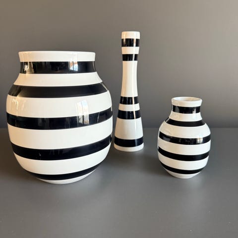 Kähler Omaggio vasesett i keramikk med karakteristiske svarte og hvite striper. Settet består av to vaser i ulike størrelser og en lysestake egnet til både enkeltstående blomster og mindre buketter. Passer til bruk på bord, hylle eller i vinduskarm som dekorative elementer i interiøret. Designet har en enkel og grafisk stil som gjør at vasene kan kombineres med annet servise og dekor.